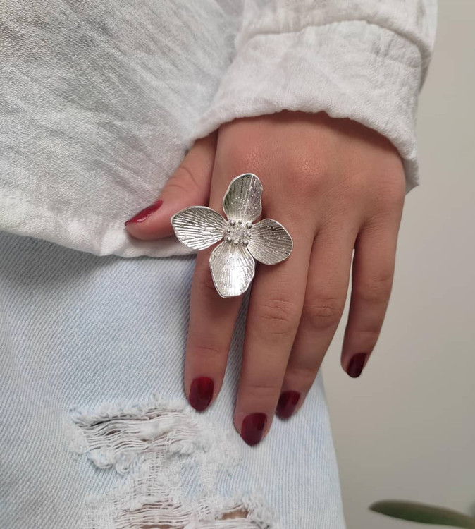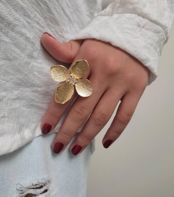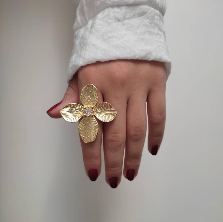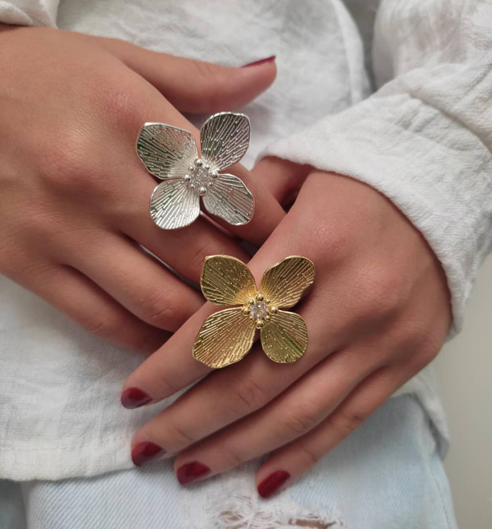 انگشتر مینیمال طرح گل در دو رنگ طلایی و نقره ای فریساز هست و براحتی برای همه سایز ها اندازه میشه کیفیت خوبی داره ولی برای حفظ جلا و درخشش بهتر مراقبت بشه