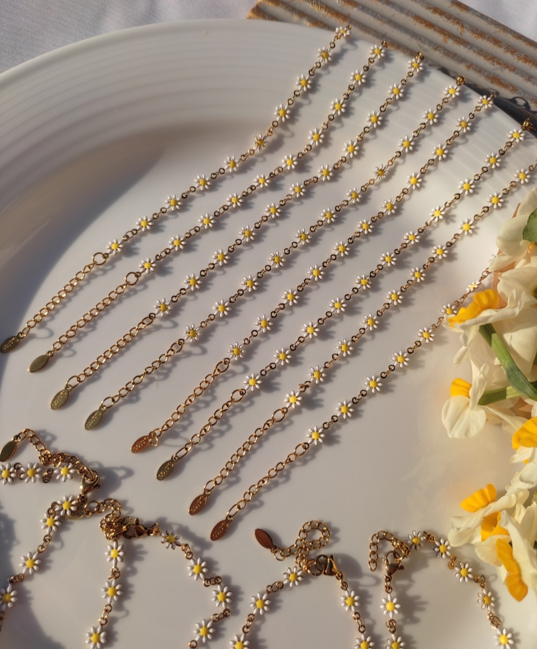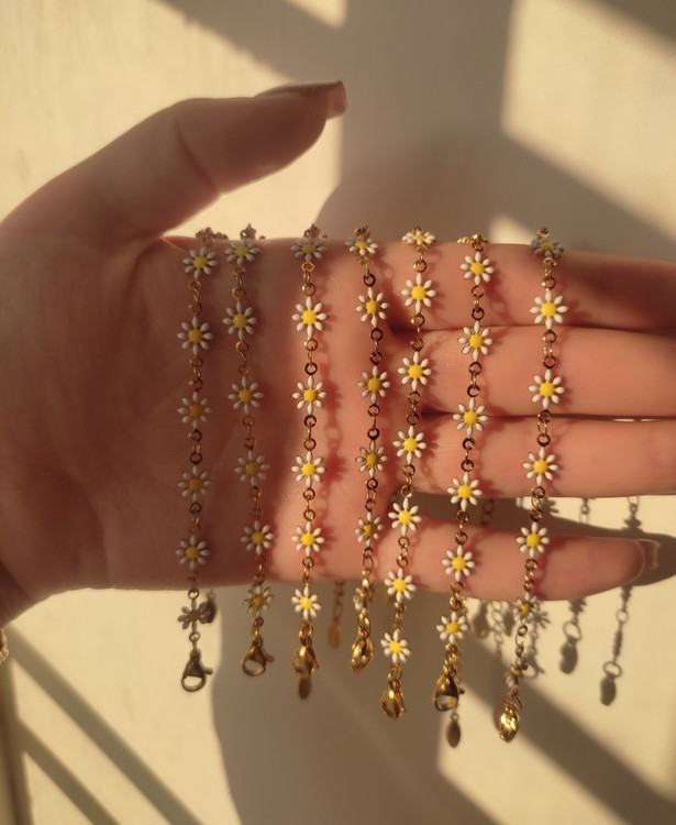 دستبند دخترانه طرح بابونه کیفیت عالی استیل و رنگ ثابت هستش زنجیر سایز داره و برای همه سایز دست ها اندازه میشه